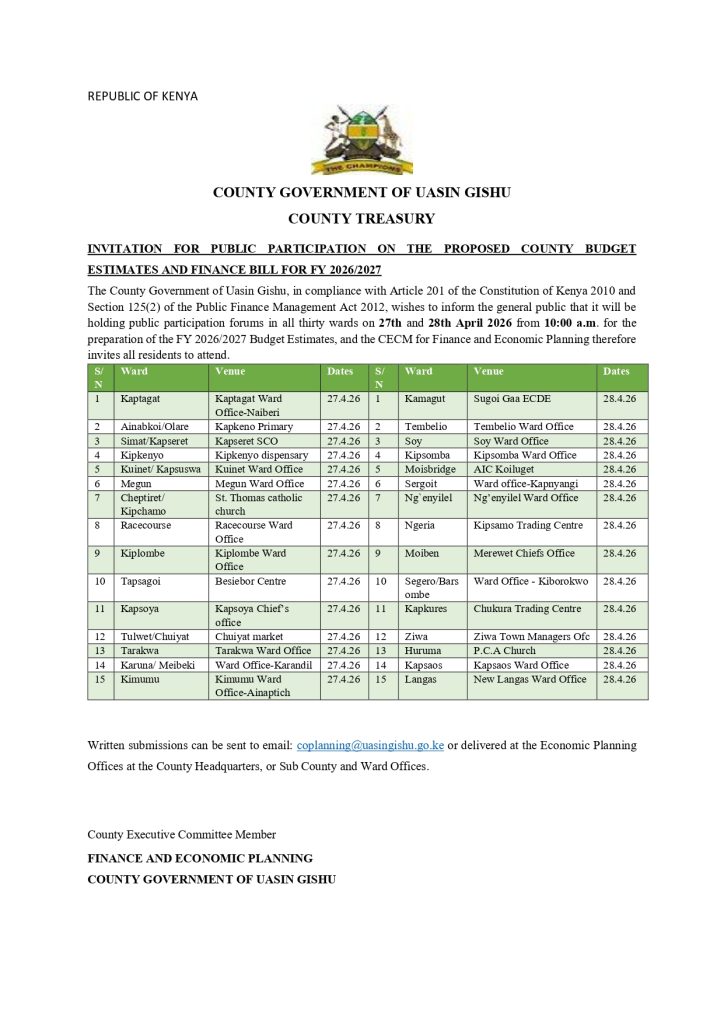 County Government of UasingishuP.O. Box 40-30100, Eldoret.